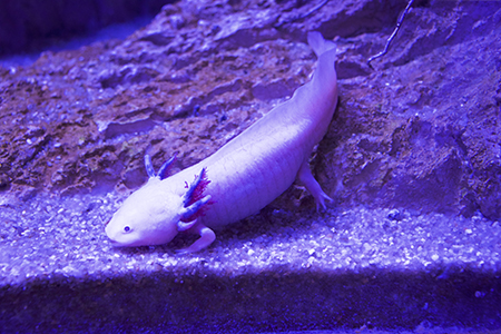 L’eau part pour un tour du monde ponctué par un effet tremblement de terre. Nous sommes à -1200 dans des gouffres, des cenotes d’eau douce où vivent des Axolotl, (ambystoma mexicanum), un amphibien mexicain avec branchies externes capable de se régénérer complètement. L’ambiance sonore s’accompagne de sensation odorante.