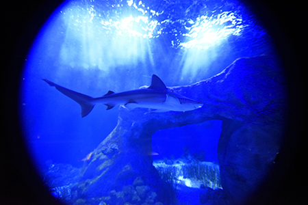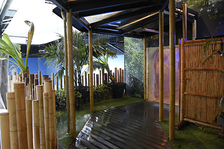 Puis on se déplace le long d’une rivière tropicale qui mène jusqu’au Lagon protégé par les coraux et l’immense baie vitrée derrière laquelle évoluent les requins.
