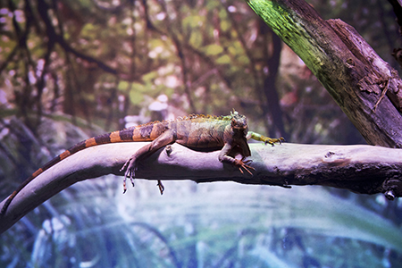 Nous plongeons dans la mangrove et les récifs coraliens. D’énormes oursins vous attendent. Un gros crapaud buffle (Rhinella marina) se camoufle dans un bac. Cet amphibien peut vivre de 10 à 15 ans.