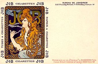 Mucha participera à la collection des 32 œuvres créées par des peintres illustrateurs pour la société Pierre Bardou-Job (Perpignan) afin de promouvoir leur papier à cigarettes JOB. On retrouvera ces créations sur des calendriers, des affiches, des cartes postales, des boîtes à tabac ou à cigarettes. La femme blonde et la femme brune de Mucha appartiennent à cette collection.