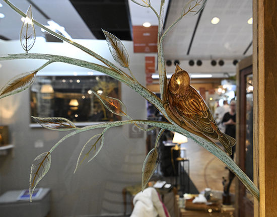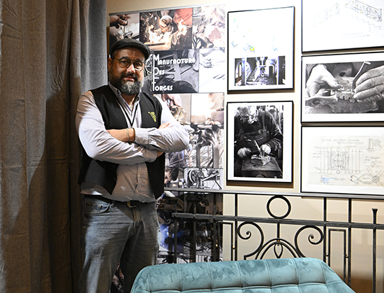 Lionel Moretto de la Manufacture des Forges a été élevé à la forge. Voulant abandonner l’école à 15 ans, il est entré dans l’atelier paternel mais rapidement il a opté pour le lycée professionnel puis son père l’a formé à la forge traditionnelle, au marteau et à la chauffe. « Le 26 octobre 2023, » nous dit-il fièrement « la ville de Santeny (Val-de-Marne) a obtenu un ruban du Patrimoine pour notre restauration de la grille du parc Montanglos en forge traditionnelle. » Il a aussi restauré les nymphes du pont Alexandre III en dinanderie traditionnelle. Son père avait calé avec exigence son savoir-faire en dinanderie, notamment sur les feuilles d’Acanthe. Un secteur devenu porteur. Les designers le choisissent le laiton pour les lustres, les linteaux de cheminée, les cages d’escalier, la décoration…