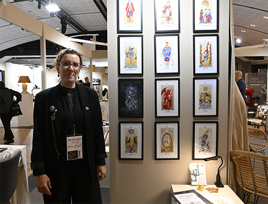 Après une visite au Musée de la carte à jouer à Issy les Moulineaux, fascinée par les jeux de carte qu’elle y a découvert, elle a décidé de préparer, avec une amie illustratrice Estelle Sanz, un jeu de tarot dont elles ont déjà dessiné les personnages, présentés au salon.