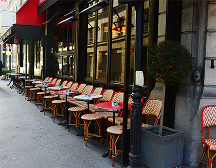 Les tables sont petites pour les têtes à têtes, les fameuses tables bistros. Elles sont plus grandes pour s’installer à plusieurs. On s’assoit sur des chaises en bois style 1900, parfois sur des bancs ou des sièges plus confortables, tressés ou recouverts de skaï de couleur.