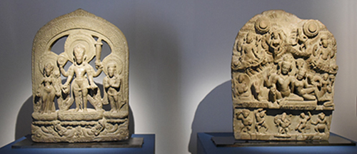Maheshvara/Shiva est avec son épouse Uma dans sa résidence himalayenne. Au dessus d’eux, Ganga déverse sur le couple divin l’eau sacrée. Cette oeuvre évoque le mythe de la descente du fleuve céleste sur la terre (Bhaktapur, XIIe ou début du XIIIe siècle). Ces oeuvres en pierre sont deux achats du musée, l’un en 1985 et l’autre en 1986. œuvres qui seraient sorties illégalement et qui pourraient repartir prochainement au Népal.