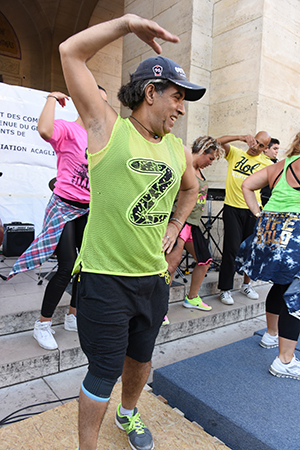 A Paris, dans le 14e arrondissement, nous avons la chance d’avoir des danseurs de Zumba qui participent activement à la vie du quartier, menés par un professeur qui irradie la joie de vivre, Karim Habbouche dit Ricco Esteban.