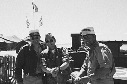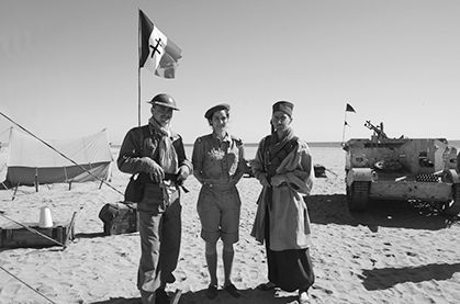 Deux légionnaires et un spahi. Une jeune femme dans le costume de Susan Travers, la seule femme légionnaire.