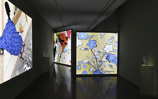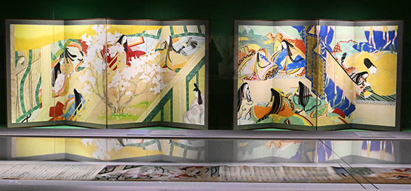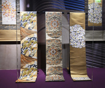 Nous sommes invités à découvrir, au cœur de l’exposition, les quatre rouleaux du Dit du Genji, des chefs-d’œuvre mesurant entre 8 et 12 mètres de long réalisés en soie tissée de Nishijin par le Maître tisserand Itaro Yamaguchi (1901-2007).