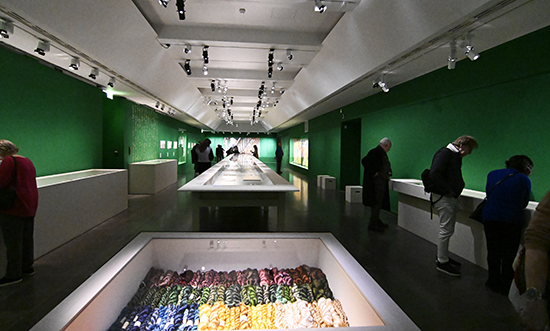 La salle où sont réunis les rouleaux du Dit de Gengi. Au premier plan les fils de soie en couleurs.
