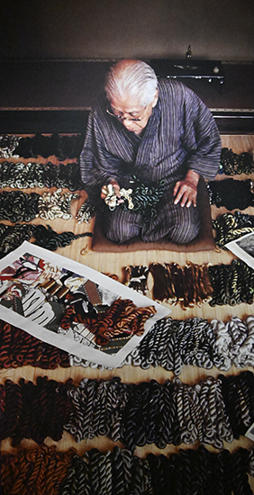 D’après une photo du maître tisserand, Itaro Yamaguchi en train de choisir ses fils et ses couleurs.
