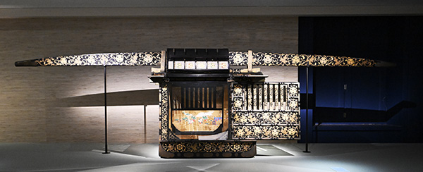 Un norimono, une chaise à porteur dont la porte ouverte laisse voir une scène du Genji.