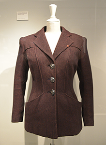 Sa veste Hermès (1944-1945). Toile de laine rouge et noire, bouton en argent. Prêt du musée Galliera, Musée de la mode de la Ville de Paris
