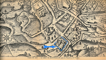 Saint-Lazare en 1609. Au loin sur la gauche, le gibet de Montfaucon, à droite l’entrée de Paris avec le mur d’enceinte de la capitale.