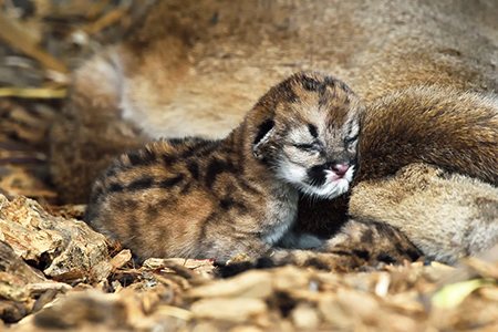 Le petit puma est blotti contre sa mère Maeli. A leur naissance les petits pumas sont tachetés de noir et prennent leur pelage uni 16 mois plus tard.