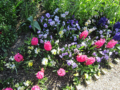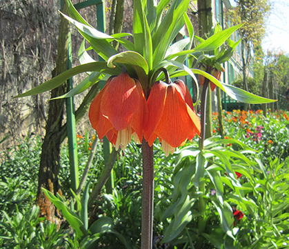 Ces espaces naturels ont été transformés en de véritables cadrans solaires végétaux. Le printemps nous offre des tulipes, des jacinthes, des vivaces : pensées, myosotis, giroflées, pavots, marguerites… dans une harmonie de couleurs chère au peintre. Elles nous mènent des couleurs froides et pâles, du rose et du bleu en passant par le jaune, l’orange et enfin le rouge. Les feuilles de pivoines sortent déjà.L’environnement de la maison va changer sans cesse au grès des floraisons.