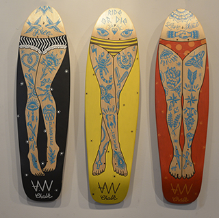 « Bien plus qu’un collectif artistique dédié à la customisation de boards (skateboard, longboard, surfboard, snowboard), Chalk Custom Board Project invite de nombreux artistes provenant d’horizons artistiques très variés, comme la peinture, le dessin, le graffiti, la gravure, la linogravure, la marquetterie et bien plus encore à découvrir leur monde. »