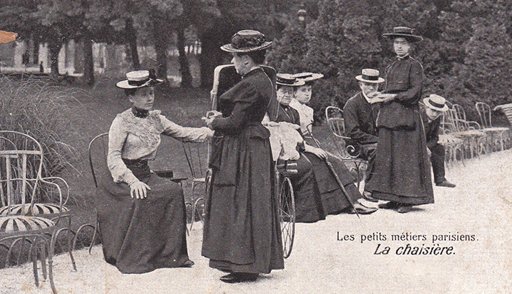 Le charmeur d’oiseaux des Tuilerie réunissait chaque jour son public. La chaisière veillait dans les parcs et jardins à ce que chacun paye son dû et la chaise sur laquelle il s’installait. Les marchands de journaux « Marchand de journaux, voilà le journal du soir, lisez le journal » ne vont plus au devant de leurs lecteurs. Les moyens de transports évoluant il y a eu des femmes cochers qui devaient maîtriser leurs chevaux au cœur d’une circulation parisienne désordonnée.