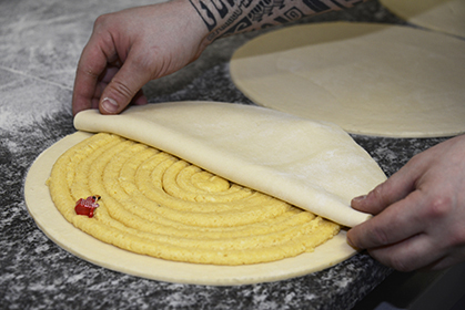 La fève est positionnée au bord afin d’éviter le couteau qui dessinera les parts.
