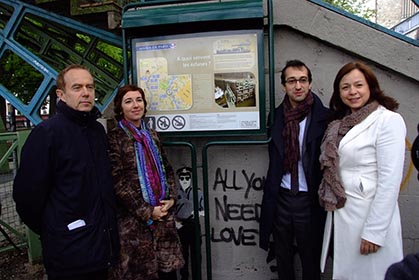 Des élus étaient présents. Devant le panneau de la passerelle Bichat « A quoi servent les écluses ? », de g. à d. : Roger Madec, sénateur de Paris, maire du 19e arrondissement (démissionnaire en janvier 2013), Anne Le Strat adjointe au Maire de Paris chargée de l’eau, de l’assainissement et de la gestion des canaux, Rémi Féraud, maire du 10e arrondissement et Catherine Baratti-Elbaz adjointe à la Mairie du 12e arrondissement, chargée de la voirie et des déplacements.