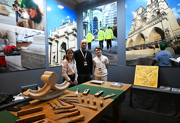 Le plomb français est une des deux sociétés qui a produit 250 tonnes de plomb pour la restauration de Notre-Dame, ses ornements, protections et l’habillage en plomb moulé de la flèche. Sur le stand des photos de Nicolas Breyne responsable commercial accompagné par Yannick Rondeux responsable HSE sécurité environnement au cœur des questions qu’on se pose sur le plomb.