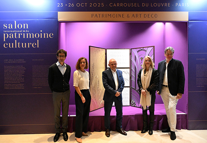 Les visiteurs découvrent, dès leur arrivée, l’œuvre créée spécialement pour le salon. Le paravent réunit le savoir-faire d’excellence de trois entreprises fidèles au salon. L’Atelier Camuset est l’auteur du panneau Les Lys Dorés, Les plâtres de Féau Boiseries réalisés à partir des originaux de Jacques-Emile Ruhlmann et du sculpteur Louis Pierre Rigal, constituent le panneau central. Le panneau de La Maison du Vitrail est une pièce inspirée des années trente qui prend un reflet rose en se détachant sur le fond.