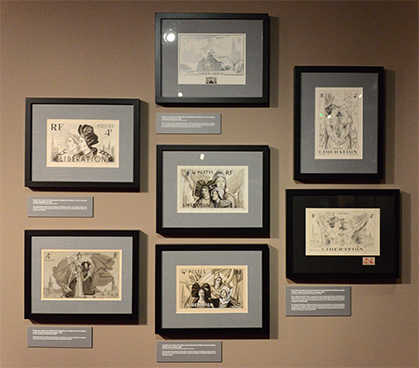 Le Musée du Général Leclerc et de la Libération de Paris – Musée Jean Moulin (Paris XVe) a inauguré, le 12 mars, l’exposition préparée avec L’Adresse Musée de La Poste (Paris XVe) et le soutien de prêteurs privés, associatifs et institutionnels pour le 70e anniversaire de la Libération. Celle-ci met l’accent sur le travail des graveurs sollicités pour chaque thème lié à la Seconde Guerre mondiale. On pourra ainsi à côté des timbres retenus découvrir les autres projets. Le parcours s’ouvre donc sur le timbre Résistance de Paul Pierre Lemagny et les autres projets, non retenus en 1947.