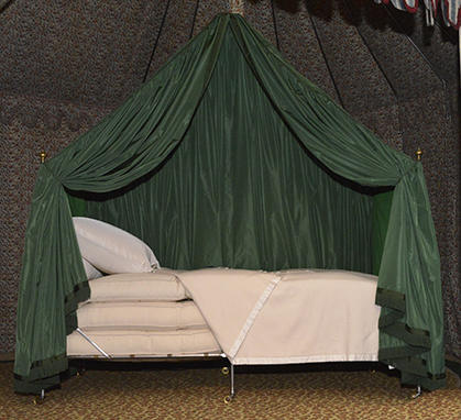 Ce lit pliant, dit lit parapluie dont le brevet a été déposé à l’INPI, a été conçu et perfectionné à la demande de l’Empereur par le serrurier Marie Jean Dessouches.