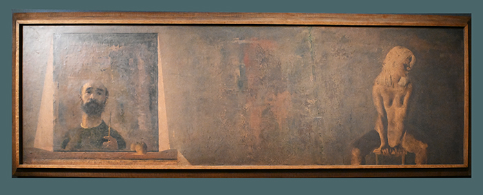 Sur l’autoportrait de Boris Zaborov, l’artiste fait se cotoyer le réel et l’irréel sur la même surface plane. L’espace réel, c’est son visage réfléchi dans un miroir. Sa vision de lui-même est la même que la nôtre devant son portrait puisque nous le regardons dans la glace. L’autre espace est irréel, il s’agit du modèle qu’il a peint.