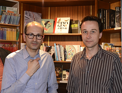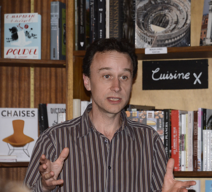 Après la conférence, un moment de convivialité entre le libraire David Cazals et le conférencier Thomas Le Roux.