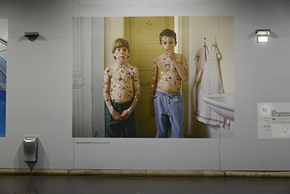 Février 2014. La station du RER B Luxembourg accueille en grand format, jusqu’au 16 mars, les jeunes photographes européens du festival Circulation(s) qui se déroule au Centquatre (5 rue Curial, Paris 19e). (Ci-dessus,de gauche à droite : Erica Nyholm : a Room of one’s own, souvenirs personnels. Thomas Rousset : Prabérians, gros plan ci-dessous. Samuel Lugassy : gymnase and Wrestler, les petits athlètes bulgares.)