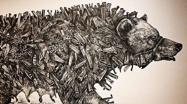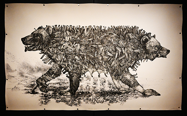 Sa création la plus récente, l’ours russe criblé de fétiches, de faux messages, pièges à pensée. Il piétine la ville ; Imprimé en report numérique.
