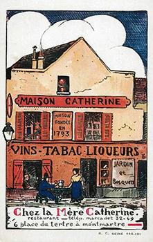 350 place du tertre catherineLes Bistros de la place du Tertre nous ne les fréquentions pas, sauf pour leur réclamer un verre d’eau. Le plus célèbre La Mère Catherine remonte à la Révolution. Catherine Lamothe s’est installée en 1793 dans l’ancien presbytère de l’église Saint-Pierre (XVe siècle), devenu bien public à la Révolution. Son établissement, café puis restaurant, a donc ouvert en 1793 au 6 rue Norvins. C’est là que les Cosaques, installés sur la Butte en 1814, disaient « bistro » (également orthographié bistrot d’où en argot le nom de bistrotier pour désigner le tenancier d’un café). Ils tapaient énergiquement sur le zinc afin d’être servi rapidement hors de la vue de leurs officiers. Les propriétaires successifs ont su garder au décor son aspect d’origine. Parmi les établissements qui ceinturent la place citons le Cadet de Gascogne, la Bohème ou encore Le Clairon des chasseurs. Il y avait aussi la Crémaillère dont plus tard j’ai fait la connaissance d’un des serveurs. Dans les années soixante les musiciens gitans parmi lesquels Manitas de Plata et Django Reinhardt jouaient en plein air ou à l’intérieur des établissements selon la saison.