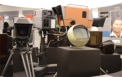 L’histoire technique des caméras et des téléviseurs met en scène les modèles les plus représentatifs de chaque époque. Elle nous conduit des premières innovations, de la télévision mécanique à la télévision à tube cathodique jusqu’aux écrans plats LCD de Sony, modèle Brava (vers 2005), avec également des dalles très grands formats UHDTV prêtées par Samsung qui vont retransmettre des images HD de Roland Garros. La nouvelle version d’écran organique OLED devrait être exposée en septembre.