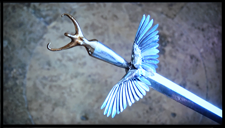 Elle a été placée sur des ailes en métal afin qu’elle « puisse prendre son envol vers de nouvelles aventures. » Celles-ci racontent une histoire singulière. Ces ailes d’oiseau qui ont été scannées appartenaient à un pinson tombé mort aux pieds de l’artiste alors qu’il était allé voir un collectionneur d’animaux empaillés pour y trouver un modèle de petites ailes.