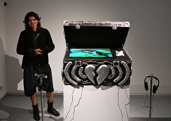 Anne Swaenepoël a enfermé dans un coffre, cage de Faraday, une vidéo qui explore entre autres, l’idée du bébé à naître qu’il faut protéger des éruptions solaires, elle perçoit le futur du petit enfant qui l’aurait vécu…