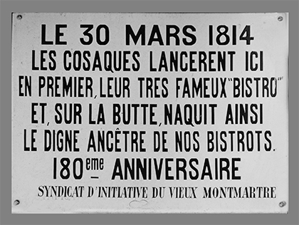 Pour les Montmartrois, il n’y a pas de discussion possible, le mot orthographié bistro ou bistrot, indifféremment avec ou sans t, a été inventé chez la Mère Catherine, place du Tertre par les Cosaques. Ils étaient à Paris, en 1814, pour rétablir la royauté. Pour être servi rapidement, ils répétaient en tapant sur le zinc : « bistro ! bistro ! » qui se traduit par « vite ! vite ! ». Une grande fête a été organisée, en 2014, pour les deux cents ans du mot « bistro ».