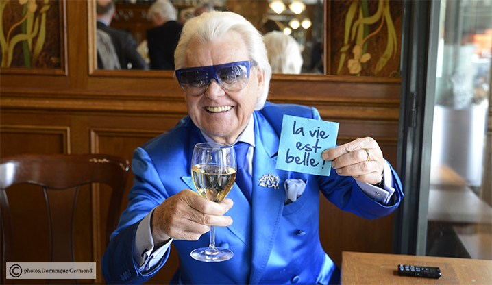 Michou, l’homme en bleu de Montmartre, aime les bistrots de son village, il est ici à La Mascotte. Une coupe de champagne à la main, le sourire aux lèvres, il est la parfaite illustration de sa formule préférée, « Elle est belle la vie. »