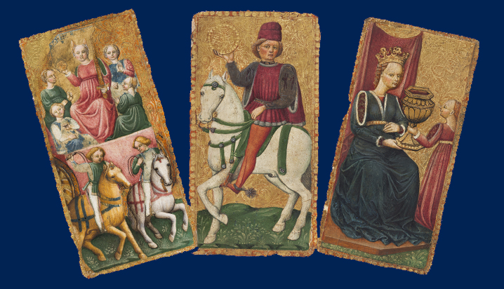 L’aventure de ces cartes ludiques et magiques nées en Italie au XVe siècle commence à la cour de Milan. Une cour dominée par les Sforza et les Visconti. Un jeu précurseur est imaginé et peint vers 1415 dans l’atelier de la famille Bembo, très active à Brescia et Crémone. Le jeu de tarot a été un univers de peintres souvent jugés comme mineurs. Les tarots sont présentés dans l’exposition entourés de manuscrits et d’objets peints.