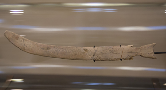Copie en 3D d’une spatule pisciforme de 15000 ans, de 19 cm, gravée dans un os de rennes représentant un saumon « Mâle » précisait, avec un sourire, Jean Gaumy. A noter, les photographies et films de Jean Gaumy sont issus de son fonds qui est à la Médiathèque du Patrimoine et de la Photographie, MPP.