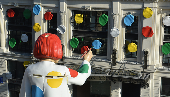 5 Janvier 2023, une structure gonflable représentant l’artiste s’est installée sur le toit du magasin Vuitton des Champs-Elysées. Elle semble y vérifier les pois de couleurs, bleus, rouges, verts, jaunes qu’elle a posé sur la façade pour annoncer la dernière collection Vuitton à pois de couleurs, la gamme « Creating infinity », maroquinerie, parfums, accessoires.