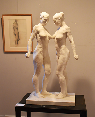 Plâtre des Jumelles de Jean Carton, le Bronze est dans les jardins de l’Elysée; derrière, dessin de Robert Wlérick Rolande debout, crayon et sanguine sur papier (coll. M. Despiau-Wlérick), à voir au 4e.