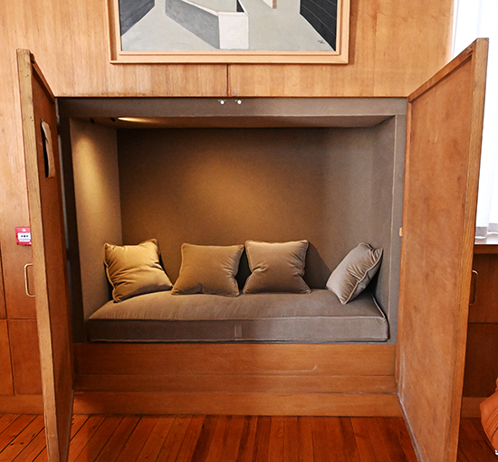 Fuyant le futile, il choisit le meuble utile intégré à l’architecture de la pièce comme son lit à découvrir dans l’atelier de peinture voisin de la terrasse.