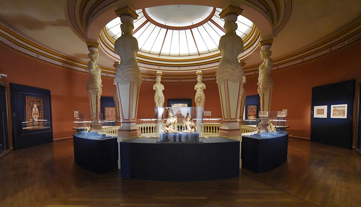 Faite le tour de la rotonde qui abritait la bibliothèque historique, où se poursuit l’exposition. Dès l’ouverture du musée en 1889, cette bibliothèque était le cœur de l’établissement. Depuis 1979, elle est classée aux monuments historiques. Les ouvrages se consultent désormais au rez-de-chaussée. En 1905, le fondateur du musée Emile Guimet invitait sous la coupole Mata Hari pour une démonstration de danses Brahmaniques.