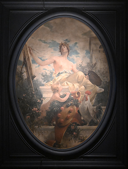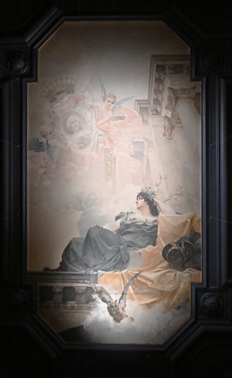 En 1881 le peintre Albert Besnard a soumis ses panneaux décoratifs la Pensée et le Travail. Ils vont décorer les deux pilastres qui forment l’entrée de l’hémicycle. Dans la niche, en lettres d’or seront inscrites les clauses du testament et au plafond on pouvait découvrir le décor : La peinture française la Villa Médicis de Théobald Chartran, Grand Prix 1877, exécuté, déposé et marouflé en 1884. François Schommer, Grand Prix 1878, a réalisé le dernier grand décor peint pour le musée de Caen, exécuté en 1885, déposé et marouflé en 1886. Il s’agit aujourd’hui du premier plafond que nous découvrons à chacune de nos visites : La Villa Médicis couronnant la comtesse de Caen.