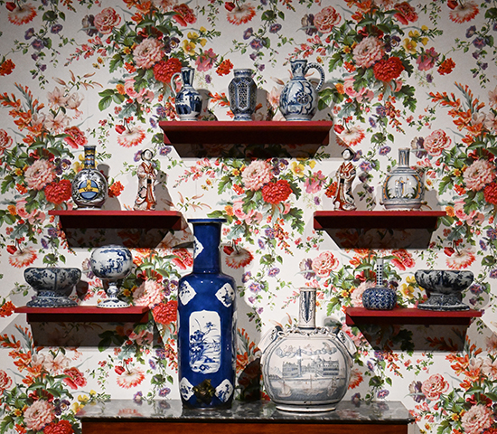 présenté sur le papier peint floral, la collection Rose-Marie, réédition du XIXe siècle par Zuber & Cie.