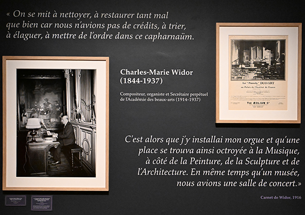 En 1914, sous la conduite de Charles Marie Widor, compositeur, organiste élu à l’Académie en 1910, secrétaire perpétuel depuis juillet 1914, le musée est nettoyé, réorganisé.