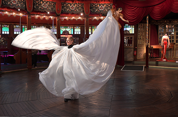 Laurette de Palma sosie de la Loïe Fuller à l’origine de la danse moderne, va évoluer dans des volutes de voiles lumineux que cette égérie a créé. Nous l’avons rencontrée lors des répétitions, testant les voiles du costume.
