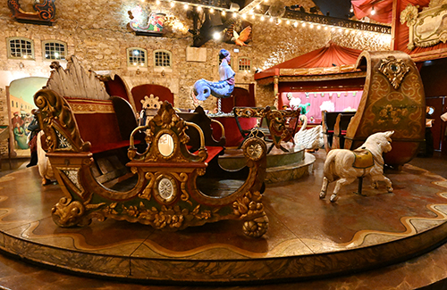De l’entrée au Théâtre du Merveilleux avec la Montgolfière et sa nacelle éléphant découvrez des bois sculptés, la salle de spectacles qui réunit de nombreuses personnalités en costumes d’époques. L’artiste aérienne, Nathalie Jeanson vous y fera rêver et frissonner.