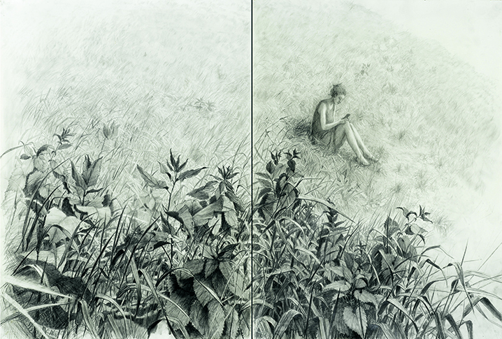 Ci-dessus : Sur la pente (2019) Crayon sur papier Diptyque (77×114 cm) – Collection particulière