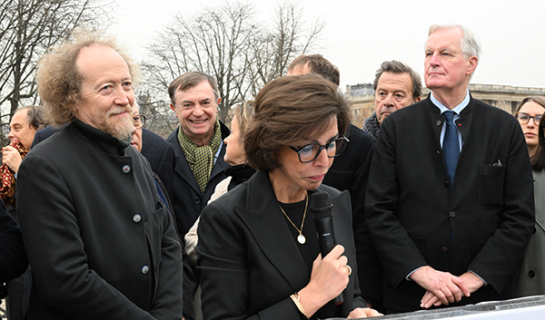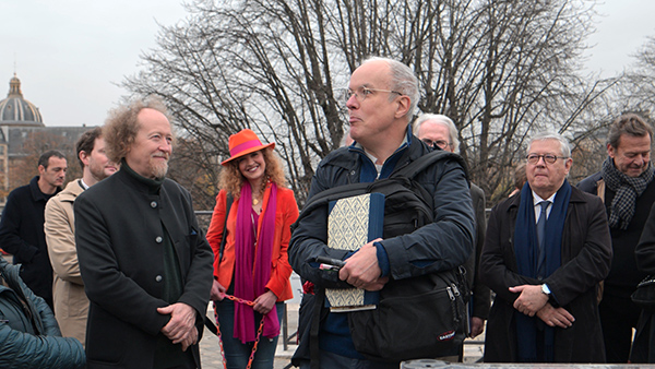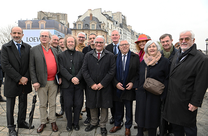 Quelques personnalités réunies autour de Jérôme Callais sur le Pont Neuf, avant la photo des présents devant l’Institut de France. L’Académie des beaux-arts avait su motiver les Académies face au danger soulevé lors de l’organisation des JO 2024.