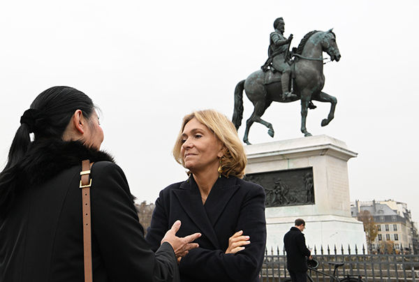 Valérie Pécresse présidente du Conseil régional d’Île de France, sous la statue équestre d’Henri IV, inaugurée en 1818. La première statue détruite à la Révolution, avait été installée à l’initiative de Marie de Médicis et inaugurée en 1607.